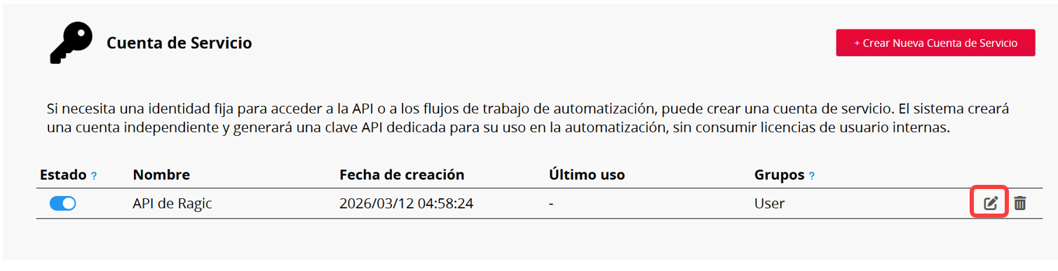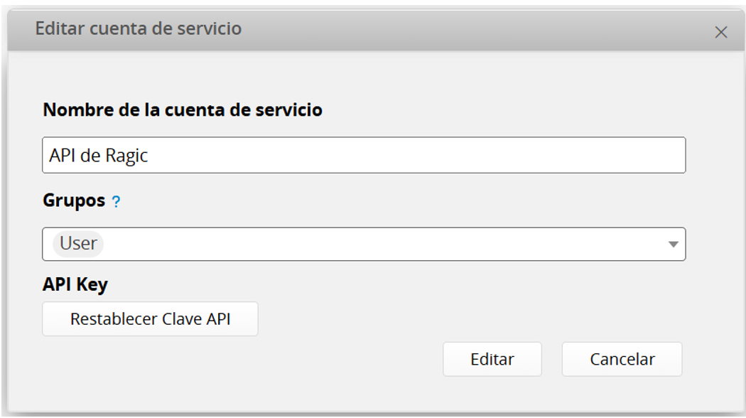 Haz clic en Editar a la derecha para generar una nueva clave API o modificar el Nombre de la cuenta de servicio y los Grupos.