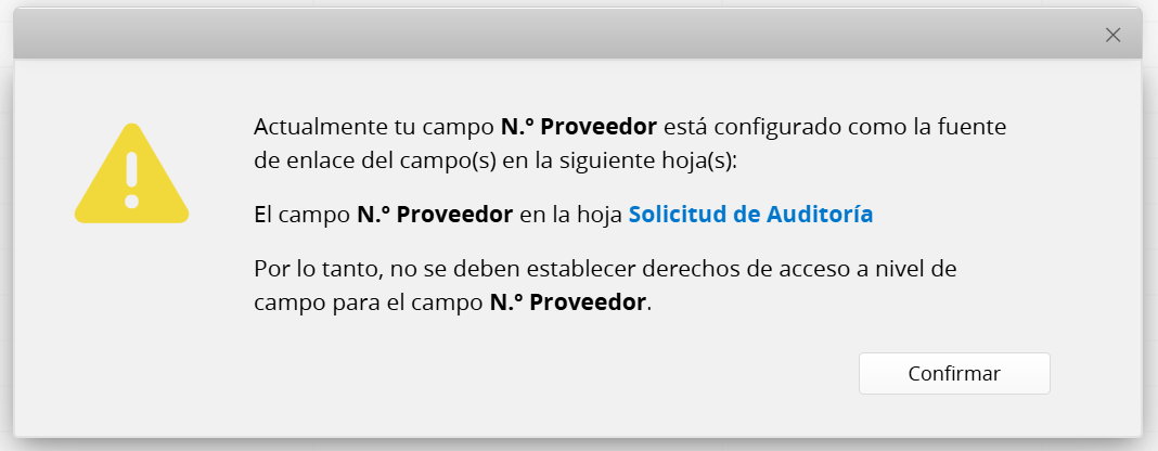2. Si seleccionas un Campo Enlazado, aparecerá un mensaje indicando que no se le pueden aplicar derechos de acceso a nivel de campo.