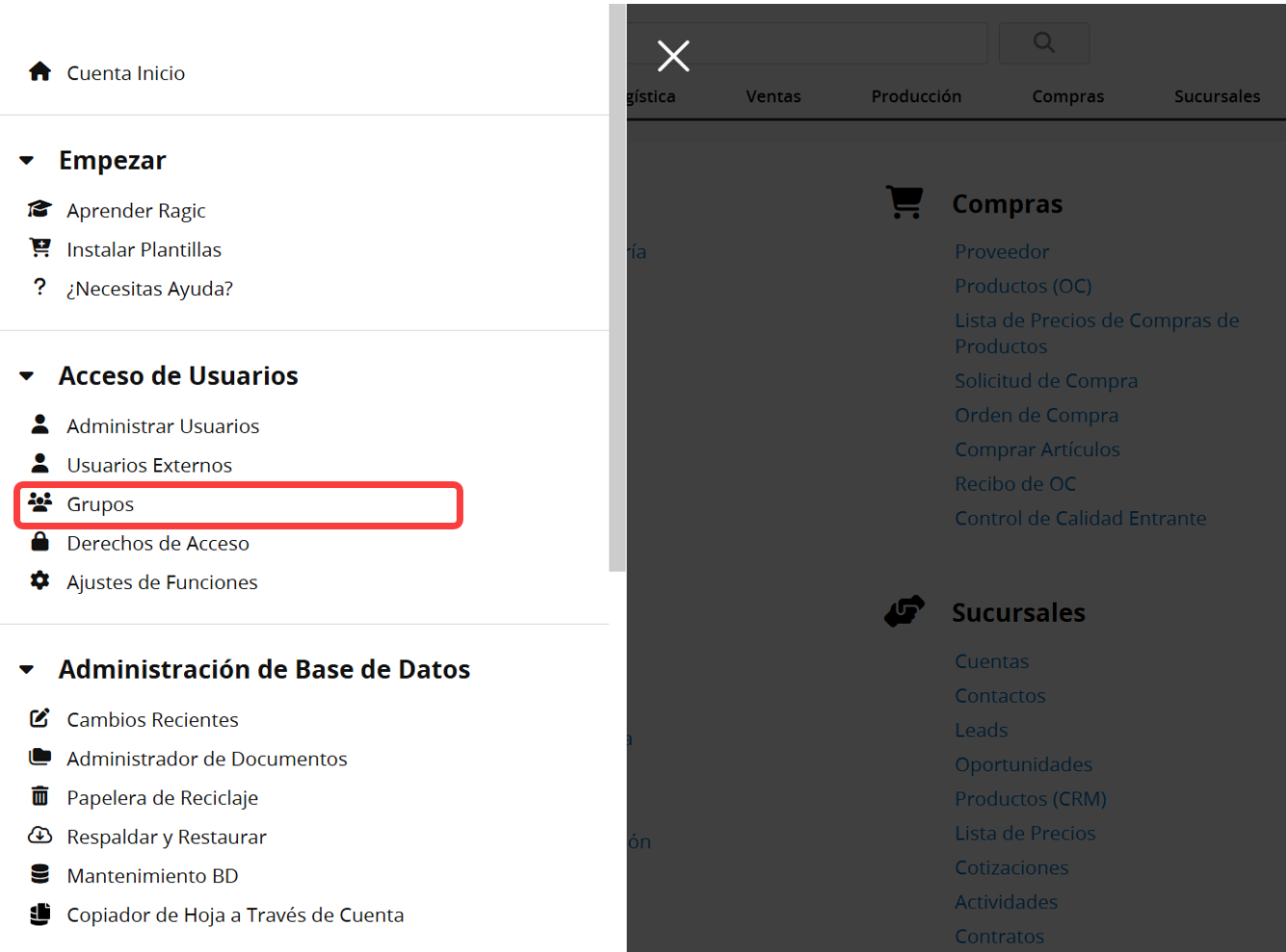 Puedes agregar nuevos grupos de usuarios haciendo clic en el ícono hamburguesa en la esquina superior izquierda de la página y selecciona Grupos bajo Acceso de Usuarios.