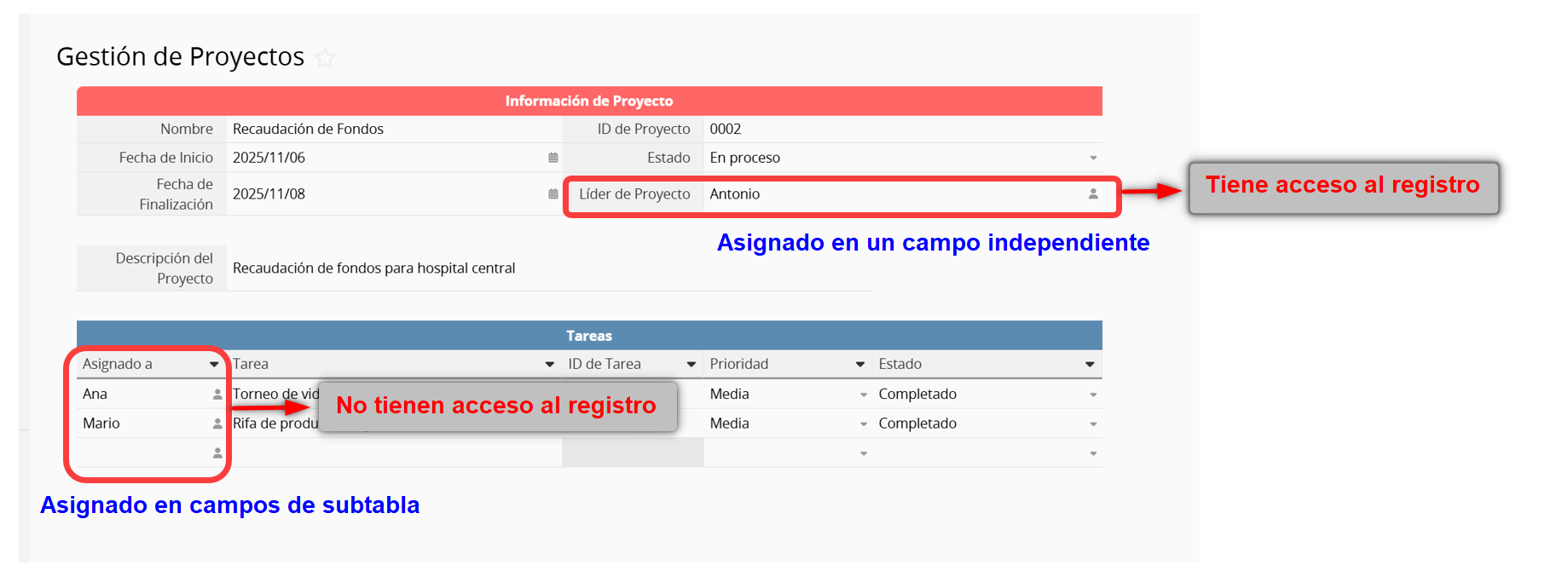 Dentro de una misma hoja, solo las asignaciones en campos independientes otorgan a los usuarios o grupos acceso de administrador de registro. Las asignaciones en campos de subtabla no designan a los usuarios como administradores de registro.