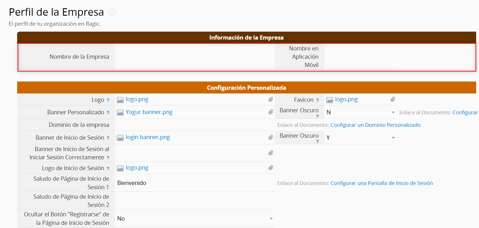 Si utilizas el plan Profesional, On-premise o Empresarial de Ragic, puedes reemplazar algunos elementos, como logos y banners, para que se adapten a tu identidad corporativa. Si utilizas el plan Básico de Ragic, solo puedes modificar la configuración de la cuenta.