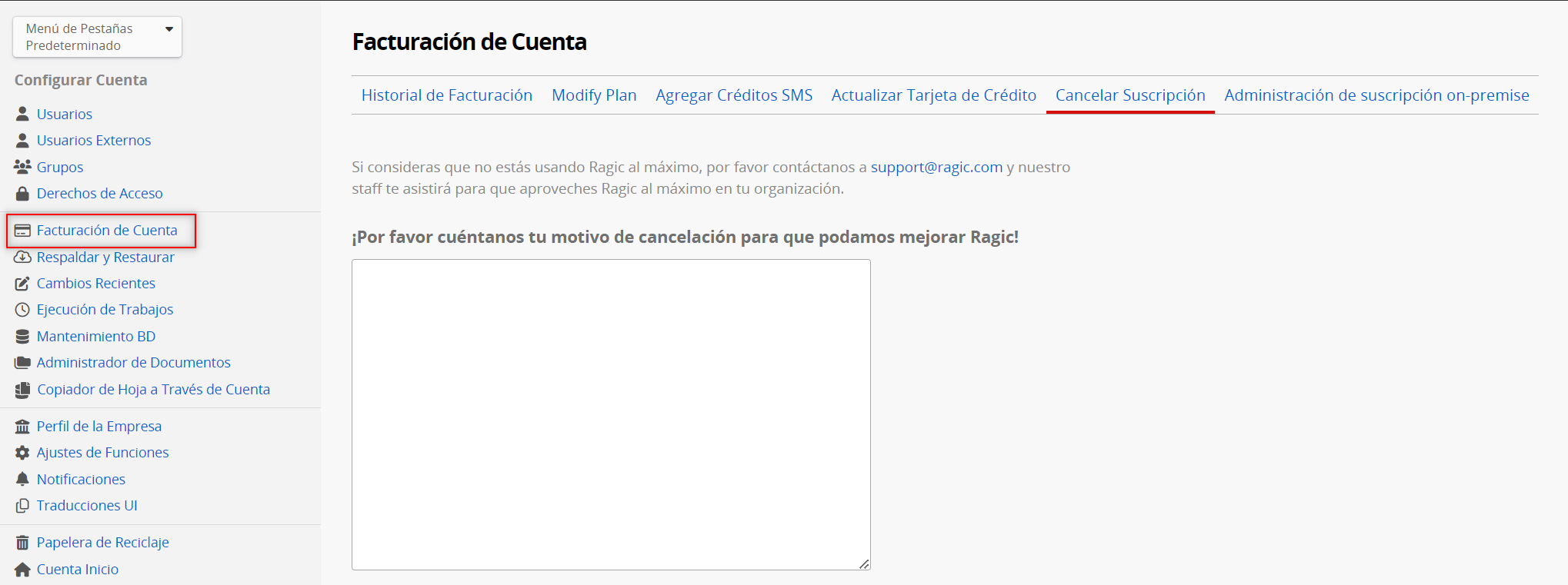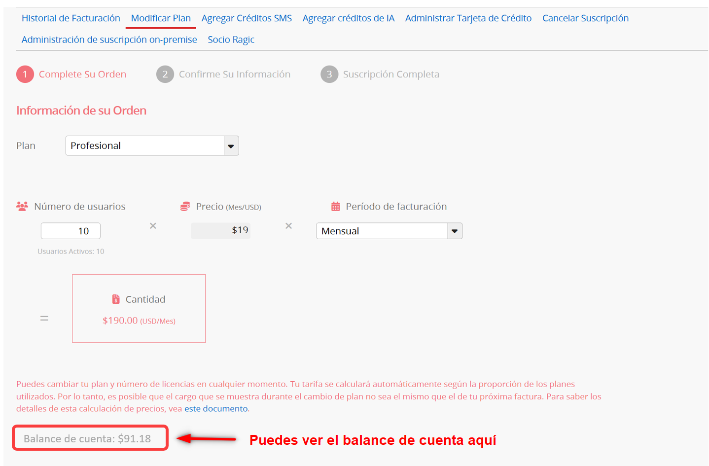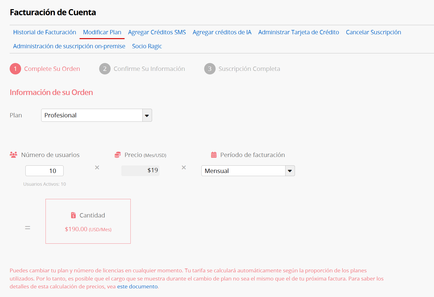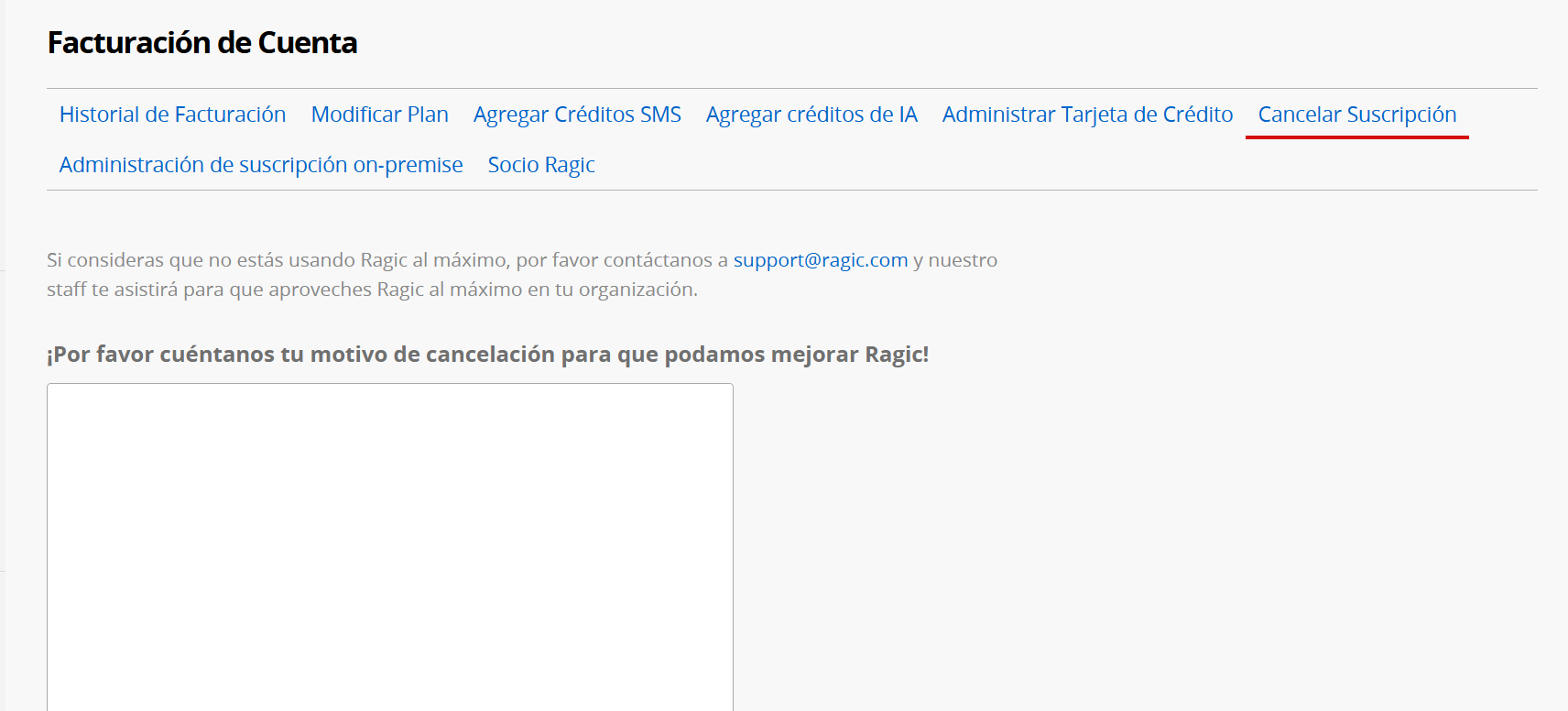 Nota: Esta página es accesible sólo para cuentas en la web. Si eres un usuario on-premise con pagos manuales y necesitas modificat tu suscripción, puedes contactarnos a sales@ragic.com.