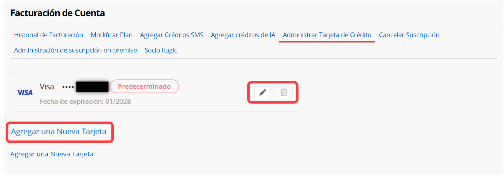 Los usuarios que pagan con tarjeta de crédito pueden modificar, agregar o eliminar la información de su tarjeta en la pestaña Administrar Tarjeta de Crédito.