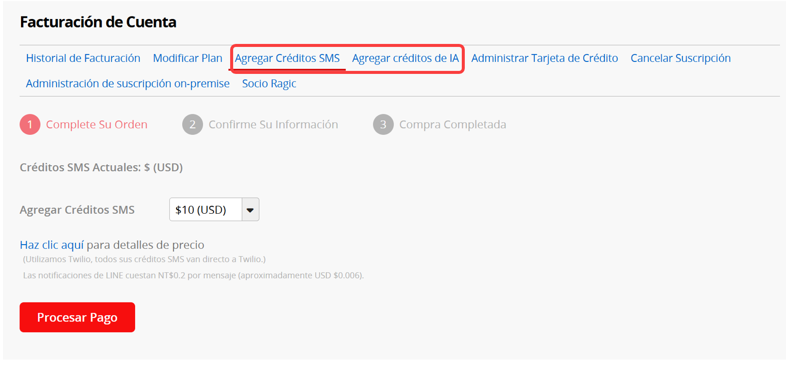 Los usuarios con un plan Profesional o superior pueden adquirir Créditos SMS y Créditos IA en la sección Facturación de cuenta. Los Créditos SMS se pueden usar para enviar mensajes SMS instantáneos y envío masivo de mensajes SMS.