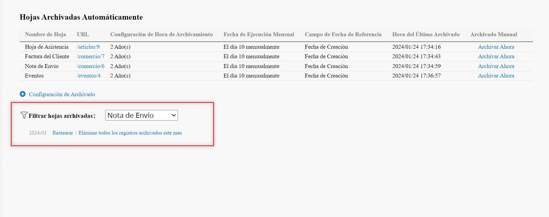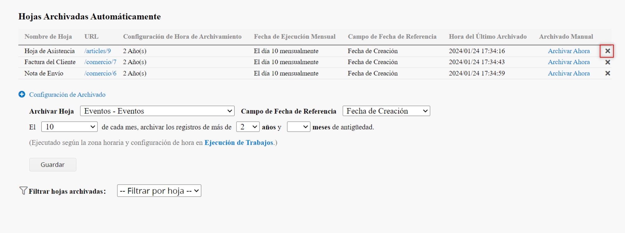 Puedes ver la configuración de archivado actual aquí, haz clic en la "X" al final de la configuración de cada hoja para eliminarla si necesario.