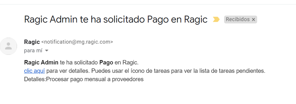 Una vez la tarea sea creada, el usuario asignado recibirá un correo electrónico y también un elemento de notificación and su página de Ragic.