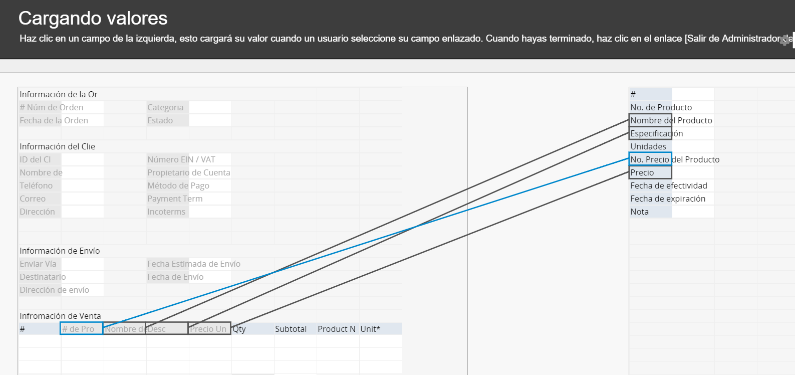 Se recomienda editar los nombres de los campos para garantizar que la información esté claramente definida. Por ejemplo, en la hoja "Orden de ventas", los dos conjuntos de enlazar y cargar desde la misma fuente se pueden etiquetar como "Cliente Solicitante" y "Cliente Destinatario".
