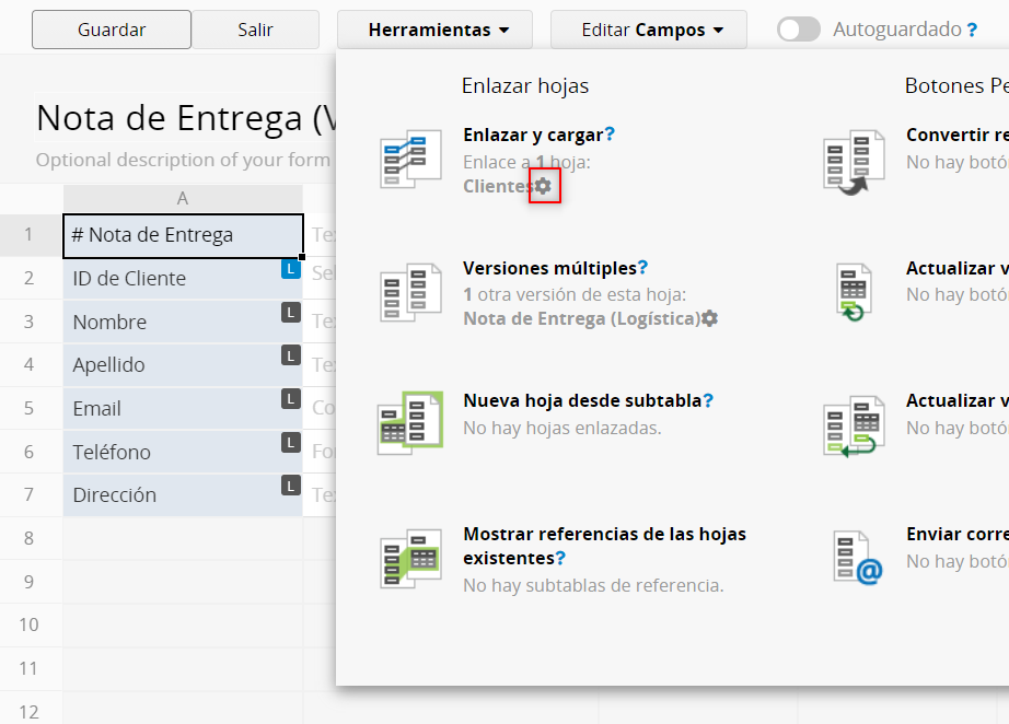 Para ello, desde el formulario, navega hacia el Modo Diseño, haz clic en Herramientas para ver la lista de hojas que están enlazadas bajo la sección Enlazar y Cargar. Haz clic el ícono configuraciones junto a la hoja correspondiente.