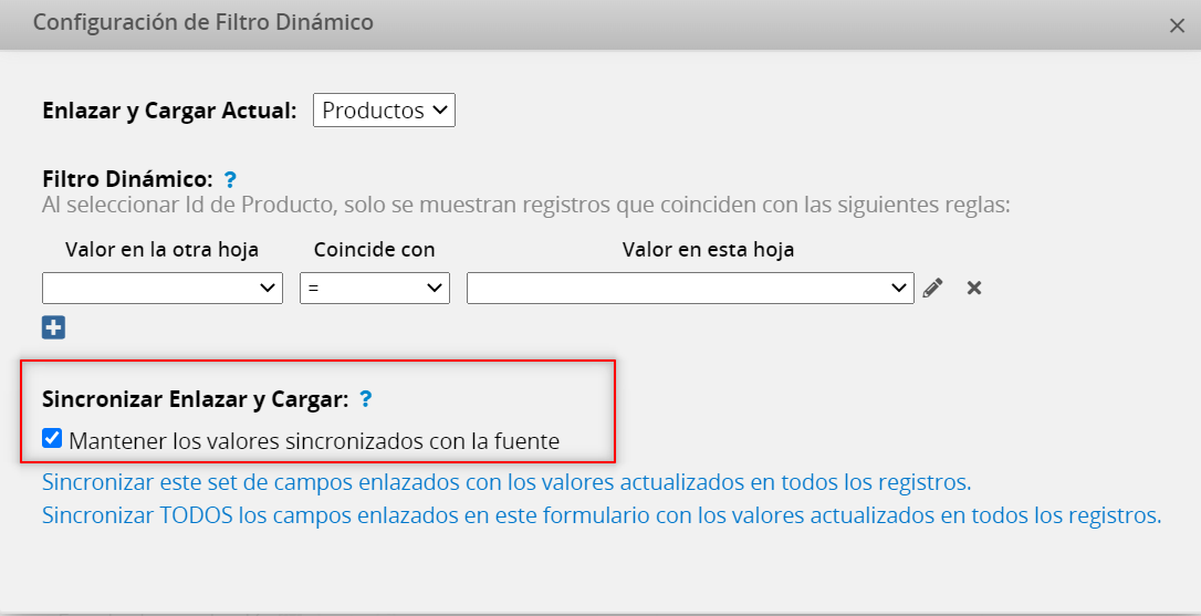 2. Para mantener los valores cargados actualizados cuando la hoja fuente es modificada, selecciona Mantener los valores sincronizados con la fuente. Esto activará la sincronización cuando la hoja fuente sea modificada.