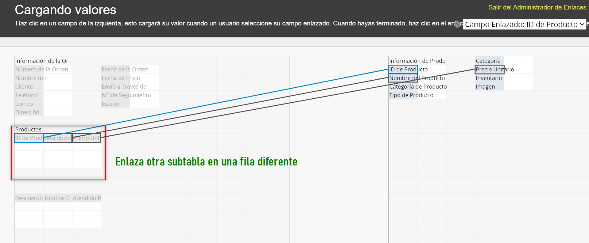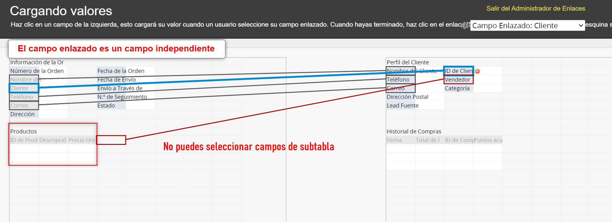 Por el contrario, si el campo enlazado es un campo de subtabla, los campos cargados también deben ser campos de subtabla.