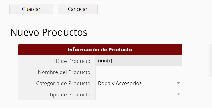 El siguiente ejemplo de diseño muestra una tienda que tiene diferentes categorías y subcategorías de productos, llamadas “Categoría de Producto” y “Tipo de Producto” respectivamente. Hemos fijado los tipos de productos en selección en cascada, pero no queremos mostrar el campo “Tipo de Producto” cuando esté vacío (cuando la categoría “Colección Especial” esté seleccionada).