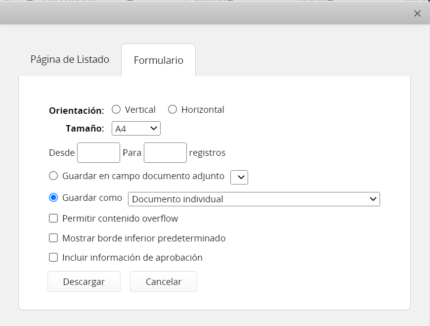 En configuración de descarga, puedes elegir si quieres exportar todos los campos o sólo los campos que se muestran en la página de listado. Puedes configurar un rango específico para exportar.