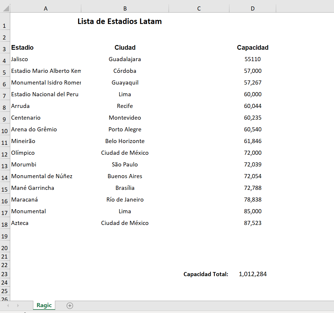 Por otro lado, puedes usar el parámetro dinámico {{l}} al calcular una lista de datos. Por ejemplo, si deseas calcular la capacidad total de todos los estadios, puedes usar la siguiente función en tu plantilla: