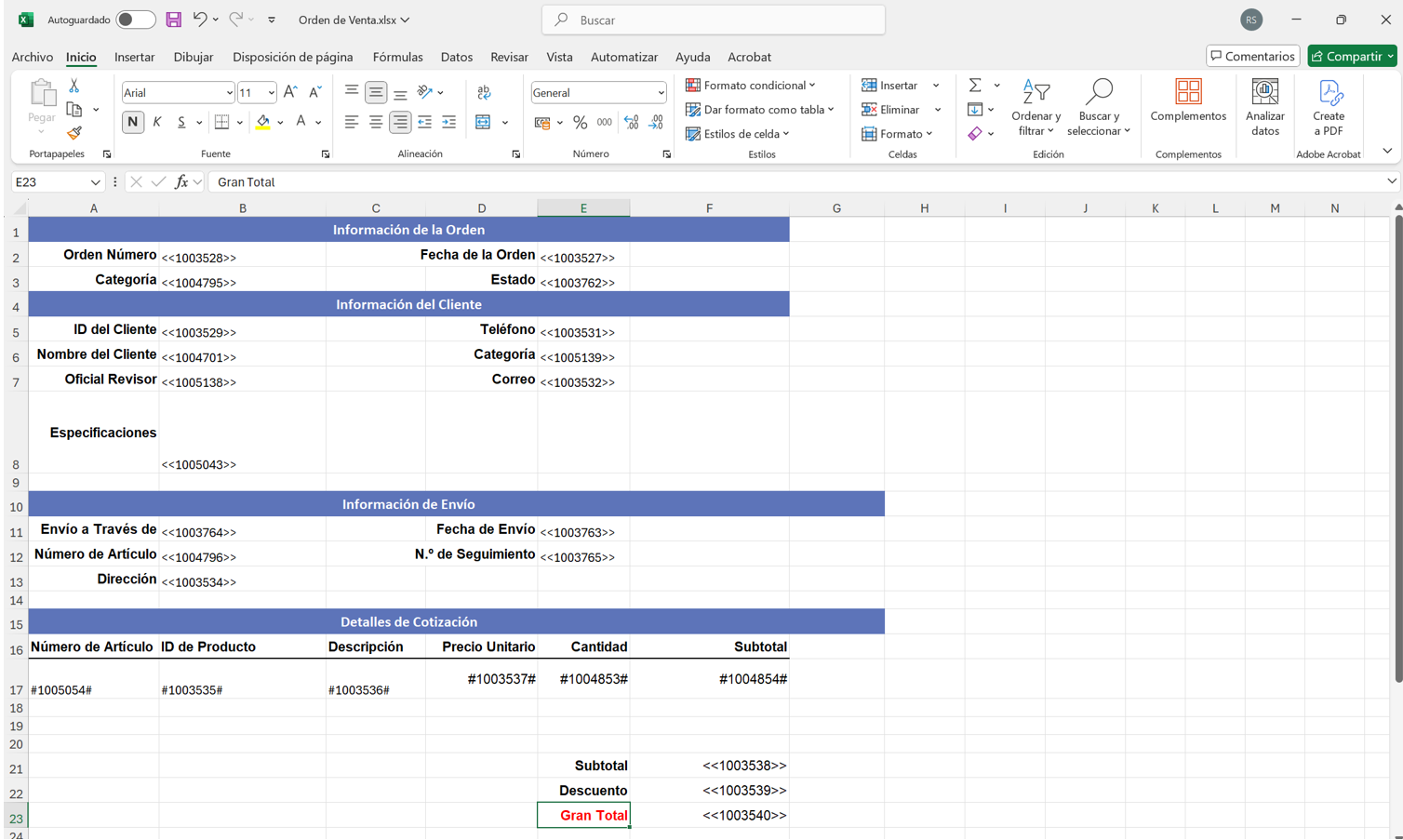 Word: Dado que Word no ofrece una plantilla descargable, puedes copiar los parámetros de la plantilla de Excel a Word y ajustar tu plantilla según la lista de parámetros.