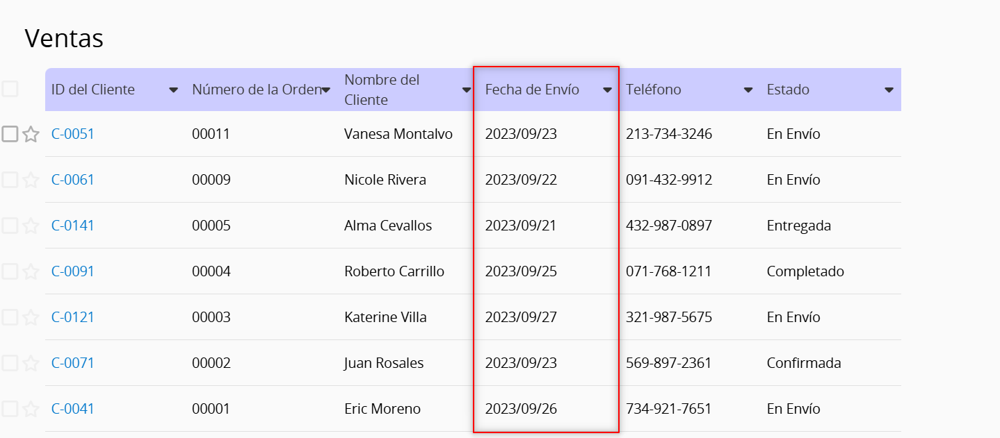Ragic puede sincronizar los datos un campo Fecha de las hojas con aplicaciones de calendario externas, como la "Fecha de envío" en una hoja "Órdenes de venta".