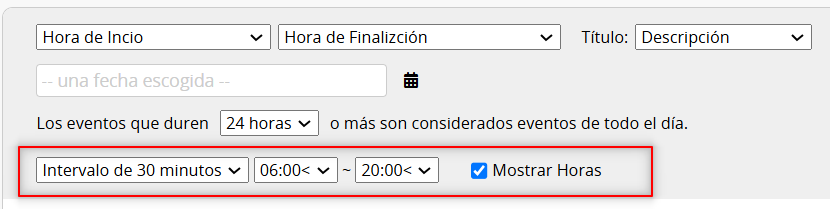 Al seleccionar el campo "Fecha de finalización", puede configurar "Los eventos que duran x horas o más se consideran eventos de todo el día". De forma predeterminada, los eventos que duran 24 horas se muestran como eventos de todo el día.