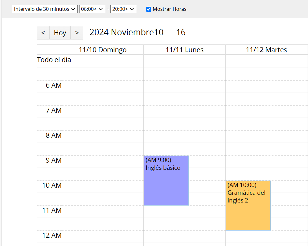 Para los modos "Día" y "Semana", puedes ajustar el formato del reloj a "12 horas" o "24 horas". Haz clic en el ícono de configuraciones para establecer el día de inicio de la semana.