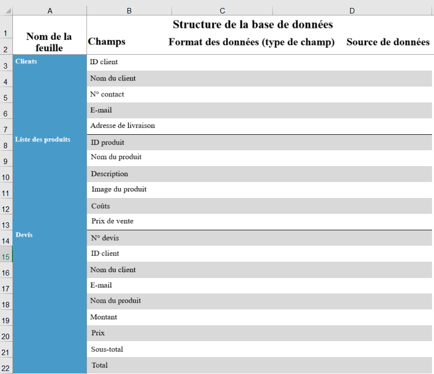 En se référant à l'organigramme de l'étape précédente, nous avons "Clients", "Liste de produits" et "Devis". Nous pouvons ensuite détailler les champs pour chaque feuille :