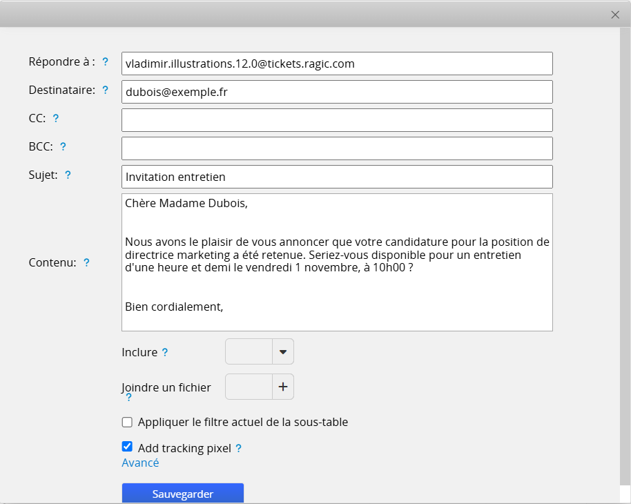 Une fenêtre pop-up vous permettra de composer votre modèle d'e-mail. Vous pouvez utiliser le formatage HTML et les paramètres pris en charge par Ragic.