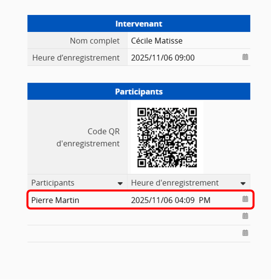 Chaque fois qu’un participant exécute ce code-barres d’action, l’administrateur système peut voir immédiatement un enregistrement de présence dans la feuille.