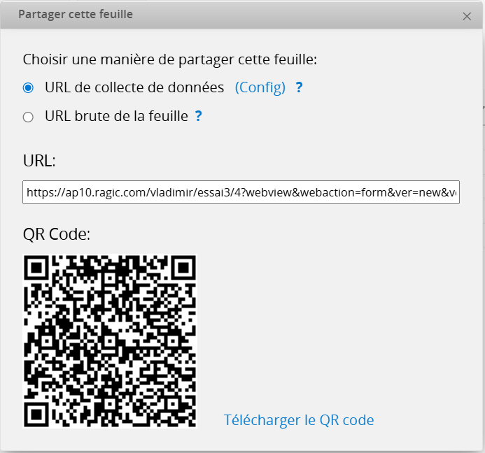 Si vous avez conçu un questionnaire en ligne ou un formulaire d’inscription à un événement en ligne avec Ragic et que vous souhaitez que les répondants accèdent au formulaire en scannant un code QR. Après avoir terminé la conception du formulaire, allez dans le menu Outils formulaire sur la page liste. Cliquez sur Partager cette feuille. Après avoir sélectionné la façon dont vous souhaitez partager cette feuille, téléchargez le code QR et partagez-le avec les autres utilisateurs afin qu’ils puissent ouvrir le formulaire en le scannant avec la caméra de leur téléphone mobile.