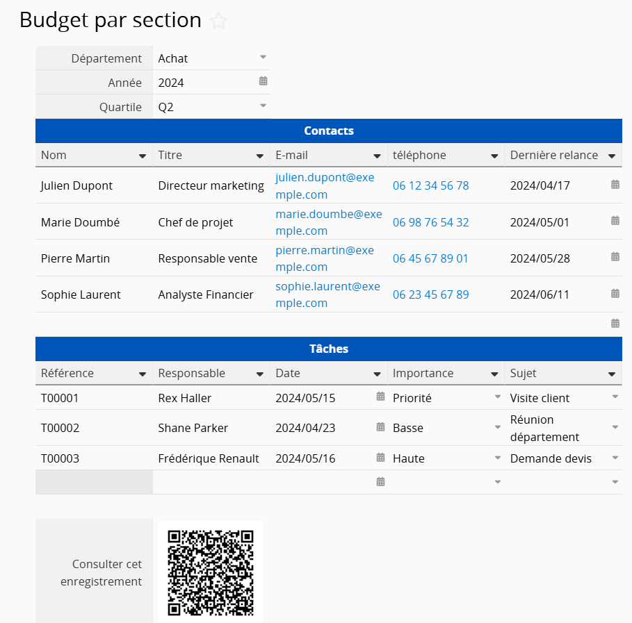 Récupérez le code-barres correspondant à l’enregistrement et scannez-le pour ouvrir ce dernier. Si ce champ est ajouté après la création de l’enregistrement, pensez à exécuter remplir les valeurs vides pour obtenir le code QR.