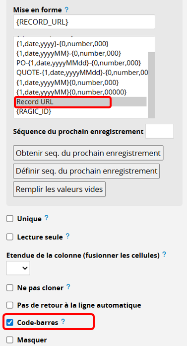 Ajoutez un champ de type Génération automatique, en définissant le format sur URL de l’enregistrement et en cochant Code-barres.
