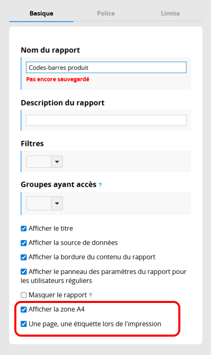 Vous devrez peut-être activer l’option “Une page, une étiquette lors de l'impression” dans les paramètres de style afin d’adapter la mise en page à la taille des étiquettes.