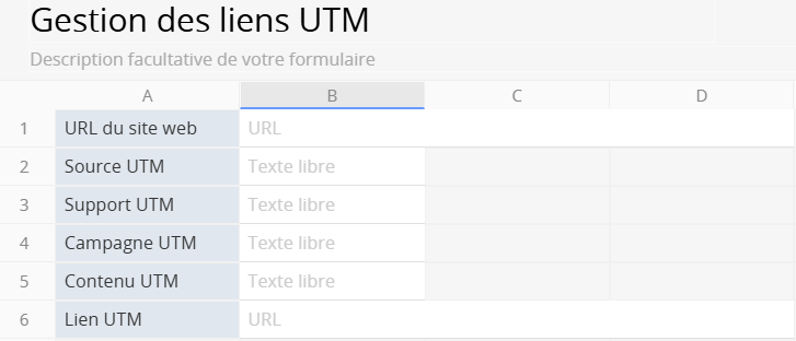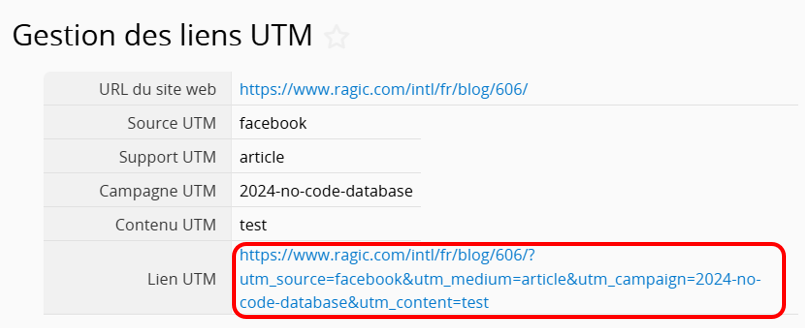 Le Google Analytics Campaign URL Builder est un outil couramment utiliser pour la création de liens UTM. Si vous voulez également enregistrer quels liens ont été partagés pour améliorer le suivi des performances, vous pouvez créer une feuille Ragic et utiliser des formules pour générer et gérer les liens UTM. Voici les étapes :