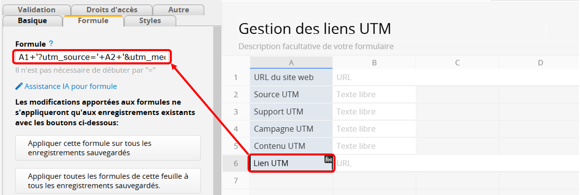 2. Comme nous souhaitons combiner l'URL du champ URL du site web avec d'autres champs de paramètres dans le champ "Lien UTM", veuillez saisir la formule suivante A1+'?utm_source='+A2+'&utm_medium='+A3+'&utm_campaign='+A4+'&utm_content='+A5 dans l'onglet formule du menu Paramètres de champ sur la gauche de votre feuille, puis sauvegardez son design.