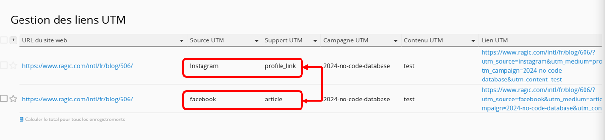 4. Sur la page liste, vous pouvez facilement visualiser les différentes sources de trafic, supports, noms de campagnes et contenus de campagne pour chaque lien UTM. You can also add fields to record the performance of each channel. Vous pouvez également ajouter des champs pour enregistrer les performances de chaque canal. De plus, vous pouvez créer une feuille distincte spécifiquement pour gérer les campagnes marketing et la relier au champ Campagne UTM en utilisant la fonctionnalité Lier et charger pour suivre les performances de chaque campagne marketing.