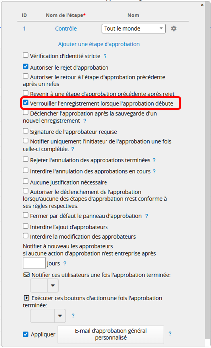 Ainsi, dans le mode design, les paramètres avancés d'approbation ont l'option "Verrouiller l'enregistrement lorsque l'approbation débute" cochée par défaut.