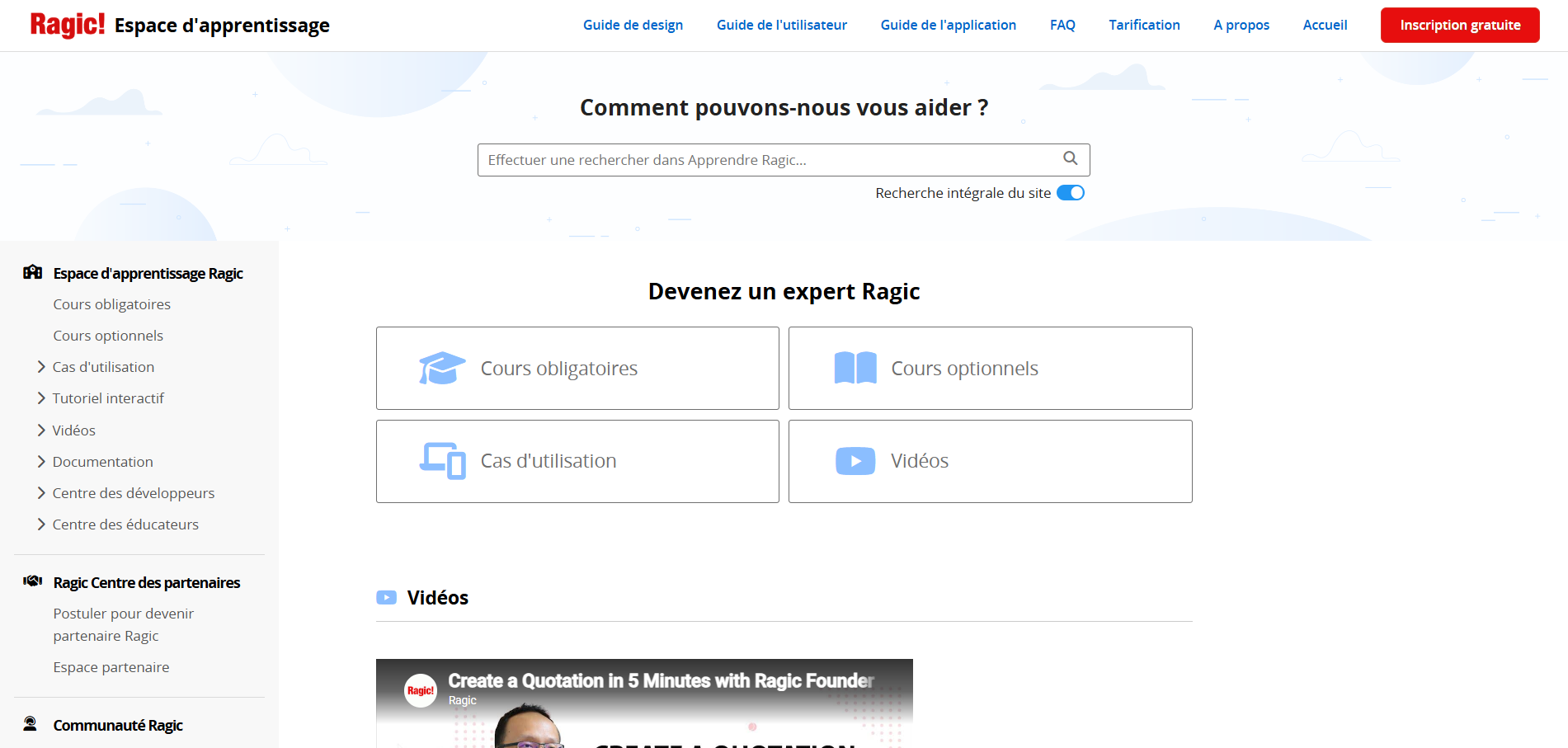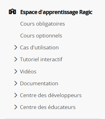 Dans la section "Espace d'apprentissage Ragic", en plus d'accéder aux Cours obligatoires, aux Cours optionnels et aux Cas d'utilisation, les ressources d'apprentissage suivantes sont également disponibles :