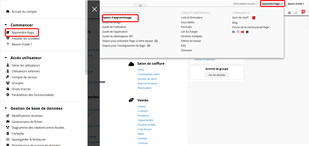 Pour les utilisateurs enregistrés : après vous être connecté, vous pouvez trouver "Apprendre Ragic" dans le "menu à bandes horizontales" sur le côté gauche de la page d'accueil ou en cliquant sur "Apprendre Ragic" en haut à droite.