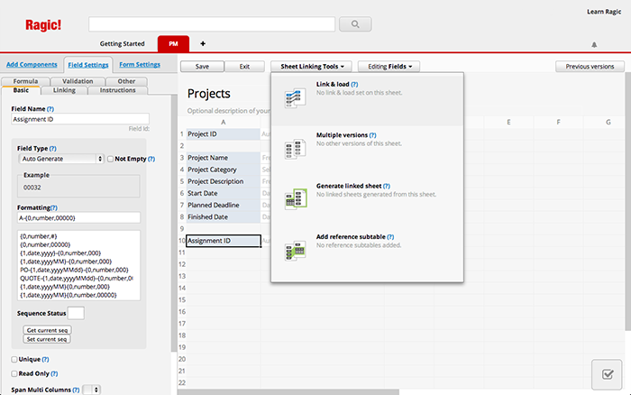 Since we would like to list employees involved in projects, we will be editing the Projects sheet. We would like to have the detail of more than one entries, so we'll add the employees with the link & load function as a subtable. But first, we'll add an assignment ID so that we can have a separate reference number.