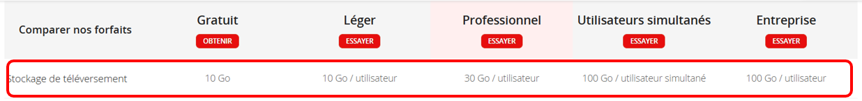 Veuillez vous référer à l’image ci-dessous pour connaître l'espace de stockage des fichiers téléversés inclus dans chaque forfait :