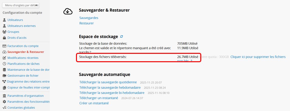 Sur la page Sauvegarder et restaurer, vous pouvez consulter votre utilisation actuelle du stockage des fichiers téléversés.