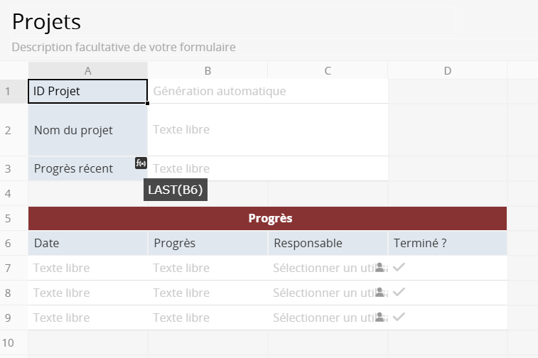 En prenant la gestion de projet comme exemple, si vous souhaitez consulter l’avancement le plus récent dans la page liste, vous pouvez ajouter un champ indépendant et appliquer la formule LAST() afin de renvoyer la valeur de la dernière ligne de la sous-table.