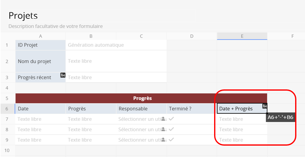 Dans ce même cas de gestion de projet, si vous souhaitez afficher directement toutes les informations de la sous-table dans la page liste, commencez par ajouter un champ de sous-table combiné avec des formules de chaîne afin d’intégrer les données souhaitées. Par exemple :