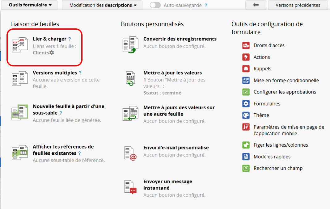 Pour plus d’informations sur la liaison de feuilles, veuillez consulter la documentation sur Lier et Charger.