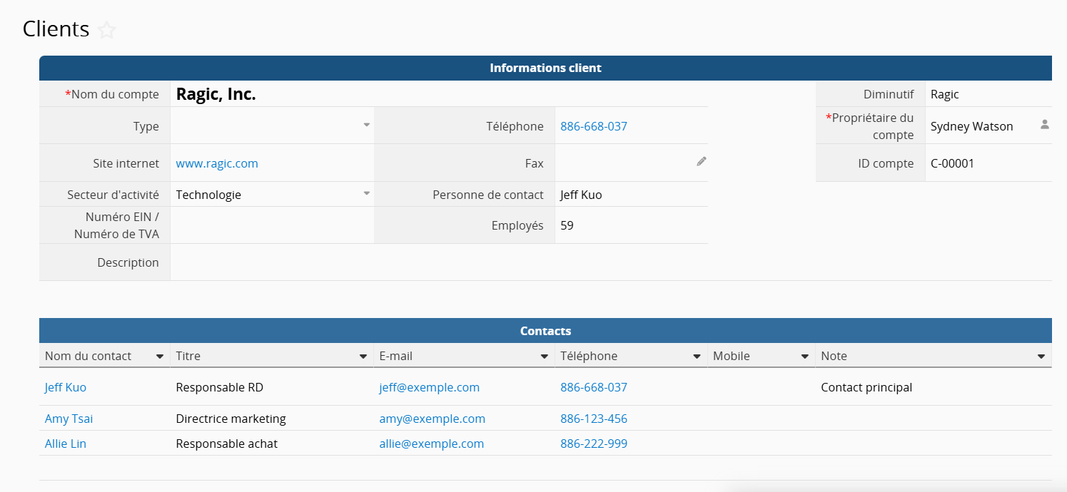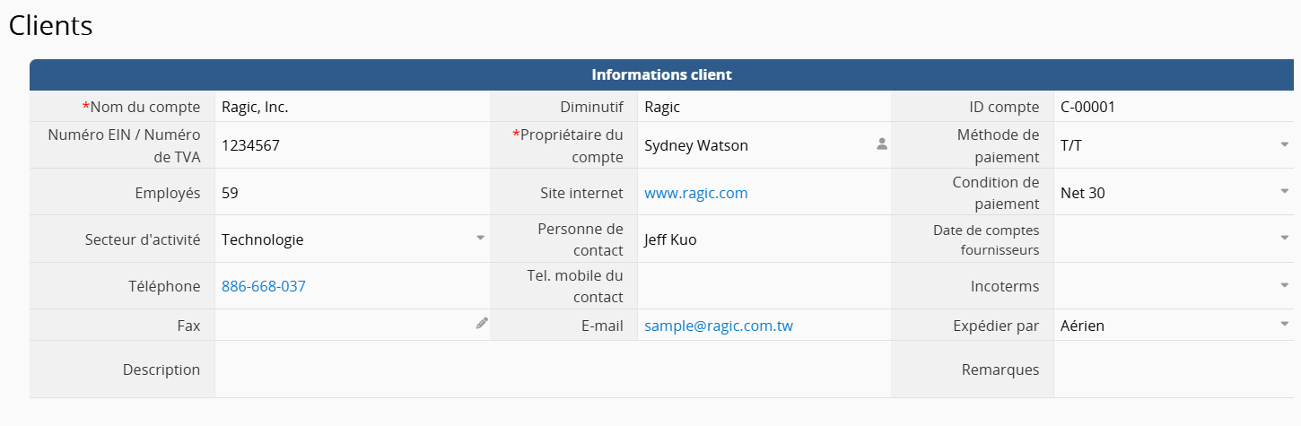 Par exemple, si les informations de contact d’un client sont stockées dans un seul enregistrement Ragic, et que le client ne possède qu’un seul nom d’entreprise, un seul numéro de TVA, etc., représentant des points de données un à un, alors le nom de l’entreprise et le numéro de TVA doivent être définis comme des champs indépendants / champs standards :