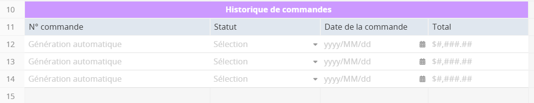 En revanche, une sous-table dans les feuilles Ragic possède des en-têtes de champ et des valeurs de champ alignés verticalement, ce qui signifie que les en-têtes de champ sont affichés horizontalement. Par exemple, les quatre champs suivants sont tous des champs de sous-table :