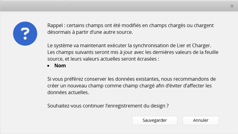 Par conséquent, avant de modifier un champ chargé, veuillez vérifier si vous devez conserver les données existantes. Si vous ne souhaitez pas que les valeurs d’origine soient écrasées lors de la synchronisation, il est recommandé de créer un nouveau champ pour charger les données, afin d’éviter d’affecter les enregistrements existants.
