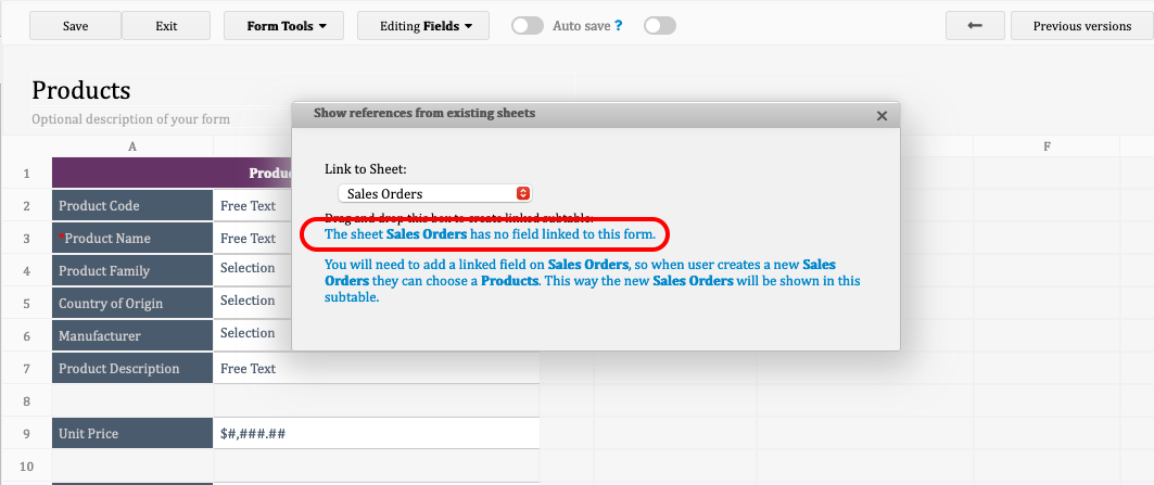 When you try to reference the "Sales Order" sheet in the "Products" sheet via show references from existing sheets, you'll get the message that indicates "The sheet Sales Order has no field linked to this form.":