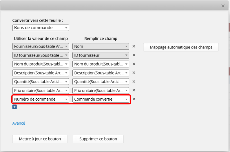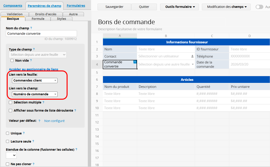 Dans notre exemple, la feuille de destination est "Bons de commande", tandis que la feuille source depuis laquelle vous déclenchez le bouton est "Commandes client". Veuillez donc créer un champ Lier et charger"Commande convertie" dans la feuille "Bons de commande" et le lier à une valeur unique de la feuille "Commandes client".