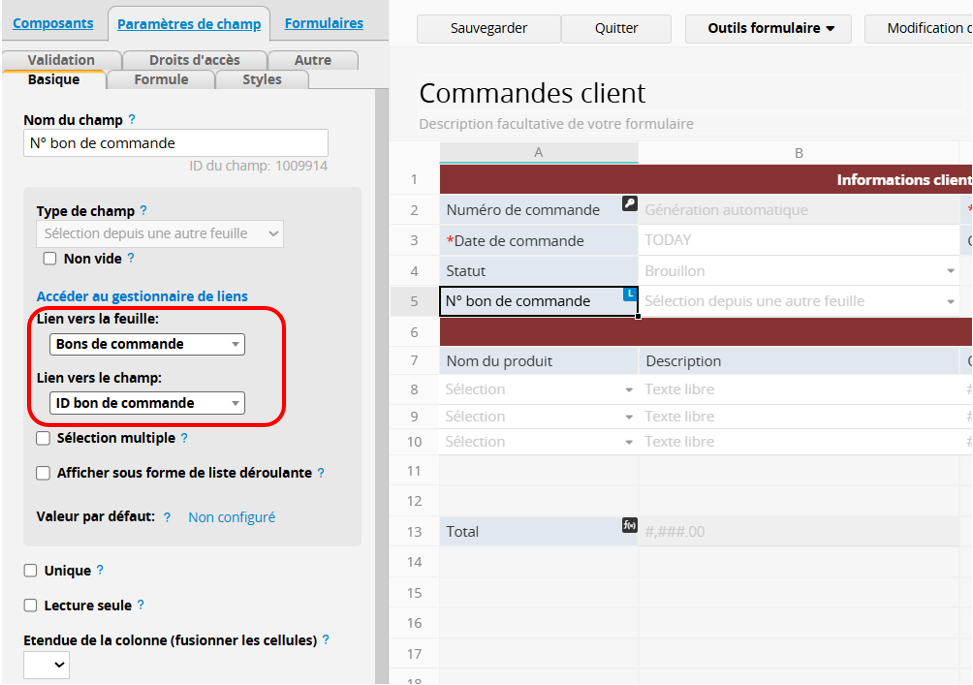 Comme à l’étape 1, veuillez créer un champ Lier et charger"N° bon de commande" dans la feuille "Commandes client" et le lier à une valeur unique de la feuille "Bons de commande". Ce champ permet d’identifier l’entrée correspondante dans "Bons de commande".