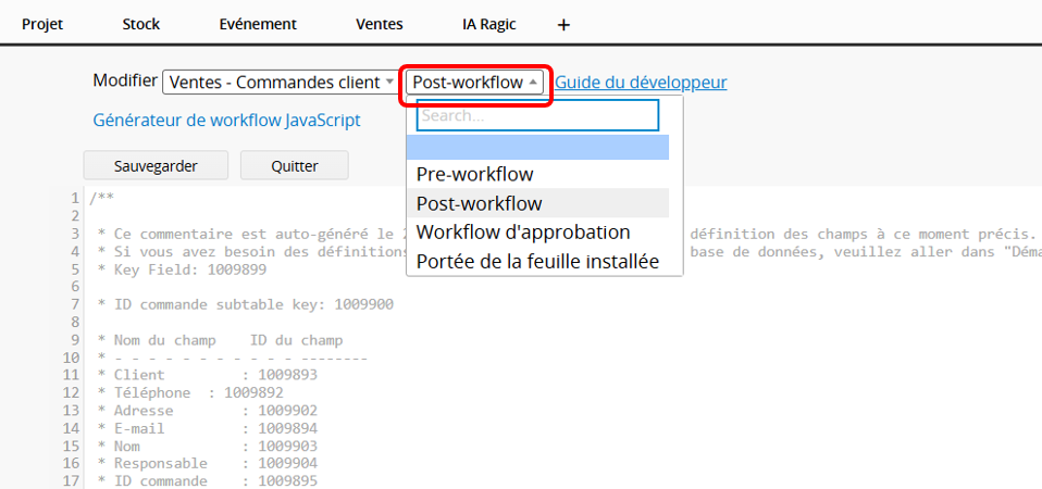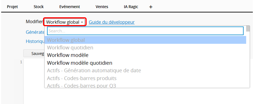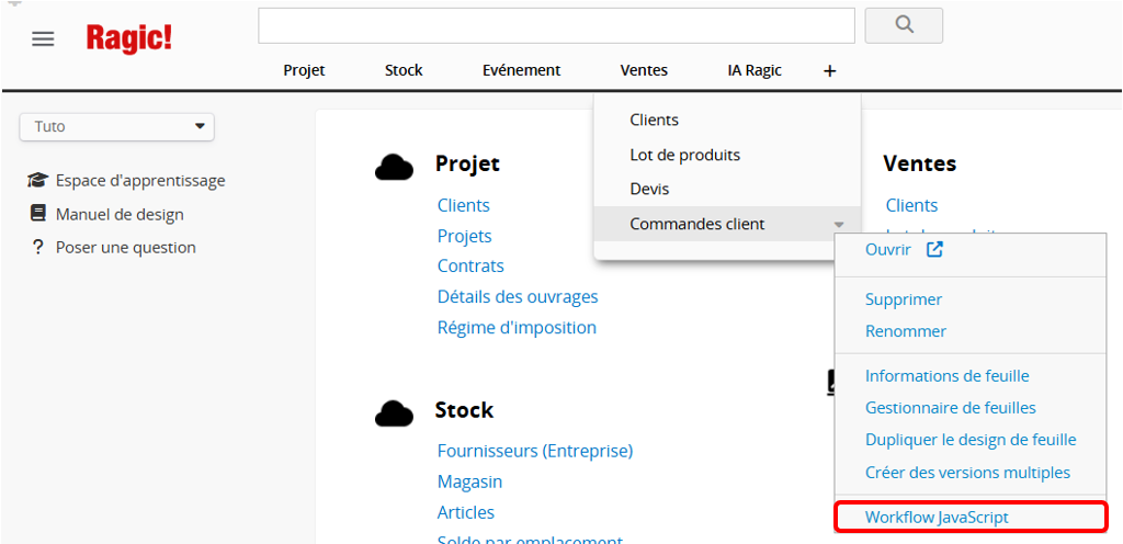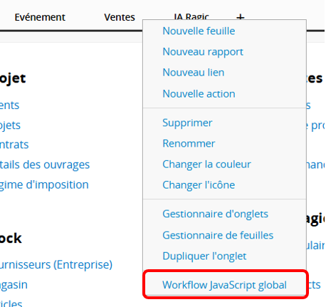 Cliquez avec le bouton droit sur le nom de n’importe quelle feuille et sélectionnez Workflow Javascript, ou cliquez avec le bouton droit sur n’importe quel onglet et sélectionnez Workflow Javascript Global.