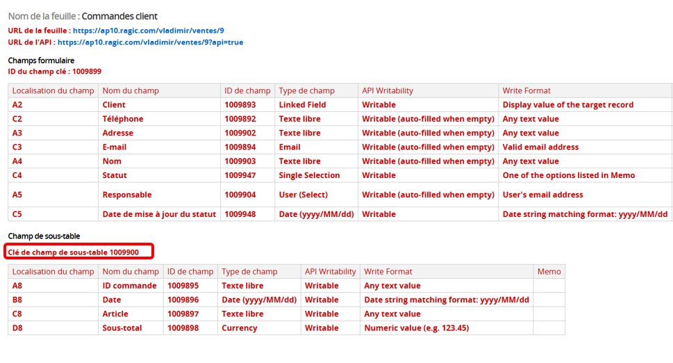 Vous pouvez trouver le champ clé de la sous-table en téléchargeant le dictionnaire des données. Pour reprendre notre exemple précédent, le champ clé est 1009900.
