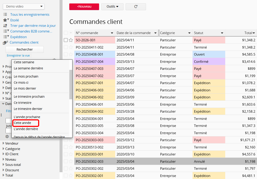 Par exemple, si vous souhaitez afficher uniquement les commandes de cette année dans la feuille "Commandes client" et archiver les enregistrements passés, vous pouvez cliquer sur l'icône d'engrenage du champ "Date de commande" dans la barre latérale gauche, appliquer le filtre "Cette année", puis l'enregistrer comme Vue par défaut ou Filtre fixe.