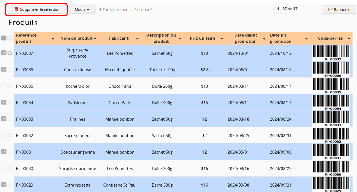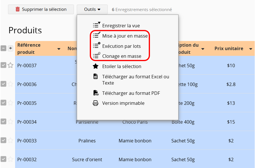 Sur la page liste, sélectionnez les entrées en cochant la case située à gauche de chaque fiche.